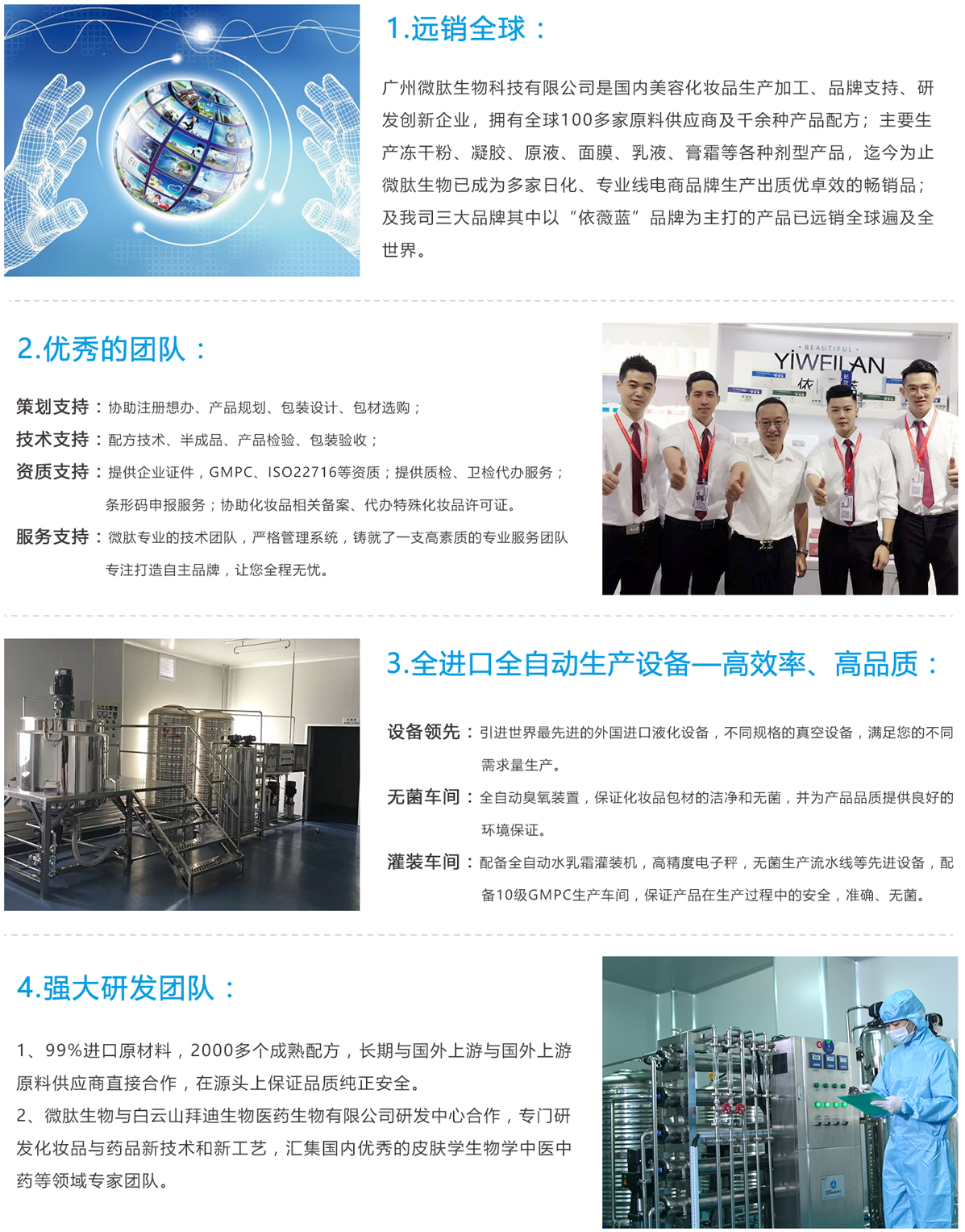 是護膚類產品、面膜類產品、身體類產品、微商化妝品加工、OEM化妝品加工,ODM化妝品加工,網購化妝品加工等產品專業(yè)生產加工的公司,擁有完整、科學的質量管理體系,是集化妝品研制開發(fā)、生產制造、技術服務、OEM/ODM品牌加工四位一體化的專業(yè)工廠,2016年微肽生物更是通過了歐盟ISO22716和美國GMPC雙重認證。工廠坐落在環(huán)境幽雅、交通便捷、物流發(fā)達的白云區(qū)石井街大朗十五社工業(yè)區(qū)。